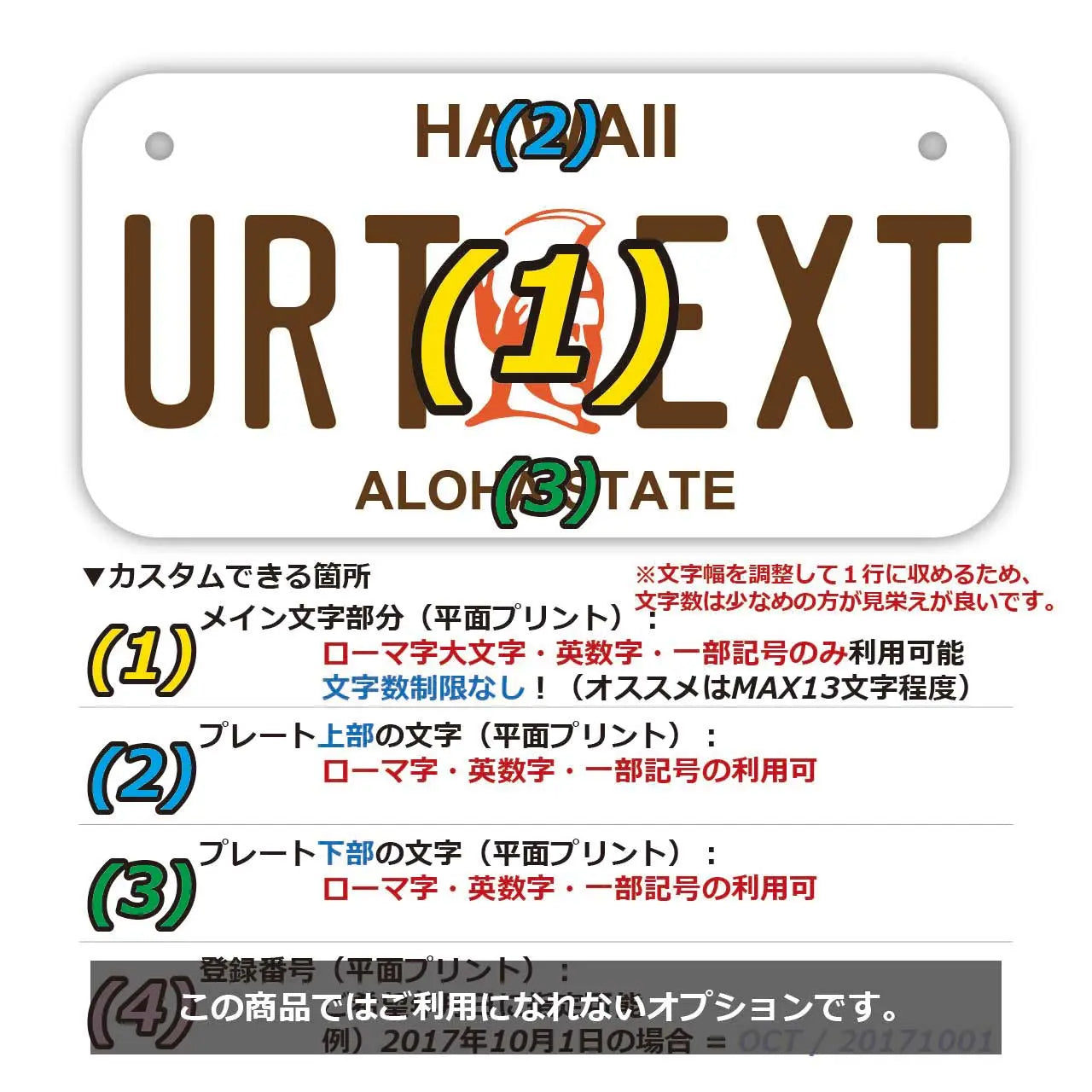 We can produce your original American license plate with the text you want, one of a kind in the world! Printed in Japan using American materials. Each plate is handmade. Tough enough for outdoor use! Holes for hanging on the wall are also included.