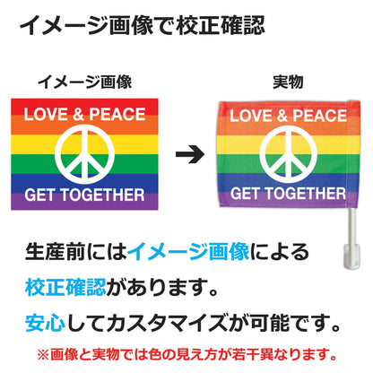 We can produce your own original car flag with the text you want, one of a kind in the world! We use car flag material imported directly from the US and print it in Japan. Each one is handmade. Tough enough for outdoor use! Easy to install by clamping it to the car window!