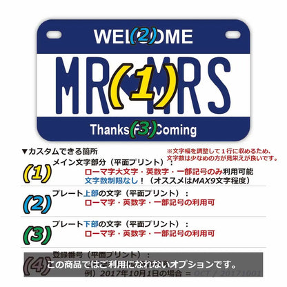 We can produce your original American license plate with the text you want, one of a kind in the world! Printed in Japan using American materials. Each plate is handmade. Tough enough for outdoor use! Holes for hanging on the wall are also included.