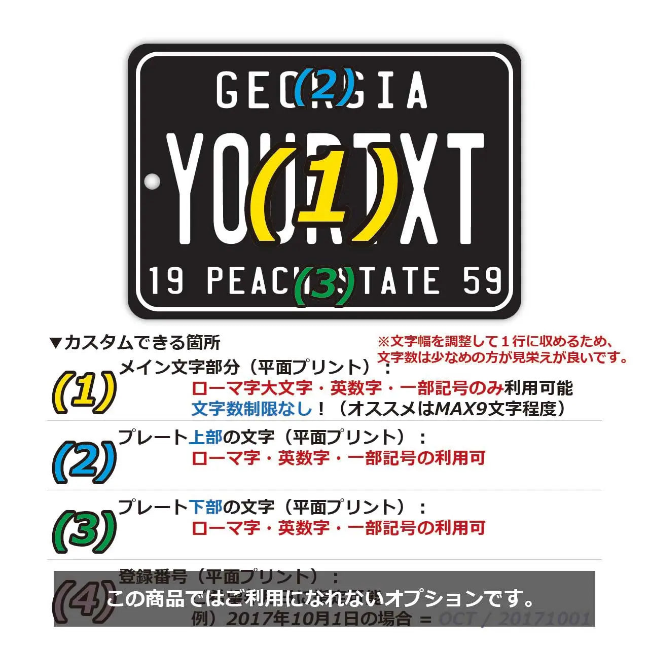 (1)メイン文字にご利用できるフォントは、アメリカナンバープレートに利用されているものと類似のフォントを使っています。