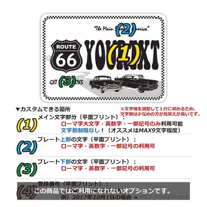 (1)メイン文字にご利用できるフォントは、アメリカナンバープレートに利用されているものと類似のフォントを使っています。
