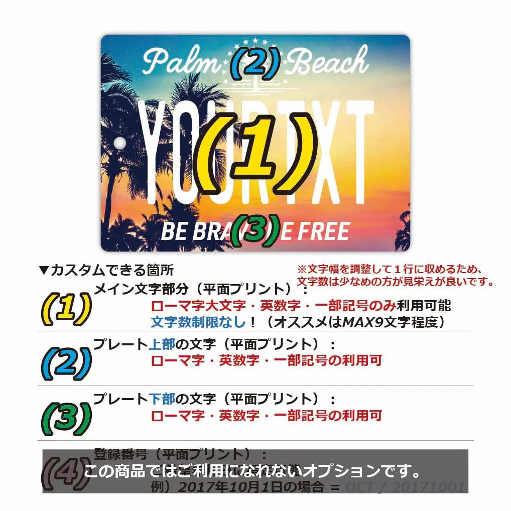 (1)メイン文字にご利用できるフォントは、アメリカナンバープレートに利用されているものと類似のフォントを使っています。