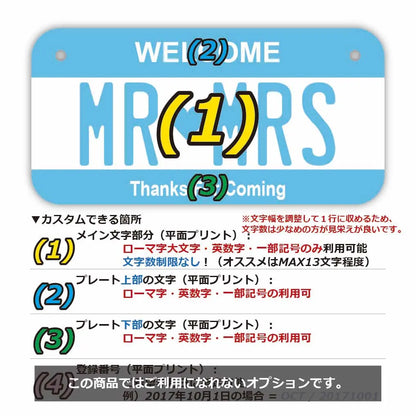 ご希望文字で1枚から生産できる、世界に1枚のオリジナル・アメリカライセンスプレート!アメリカ製素材を使い日本国内でプリント。1枚1枚を手作りしています。屋外使用もOKなタフさ!壁掛け用の穴もあります。