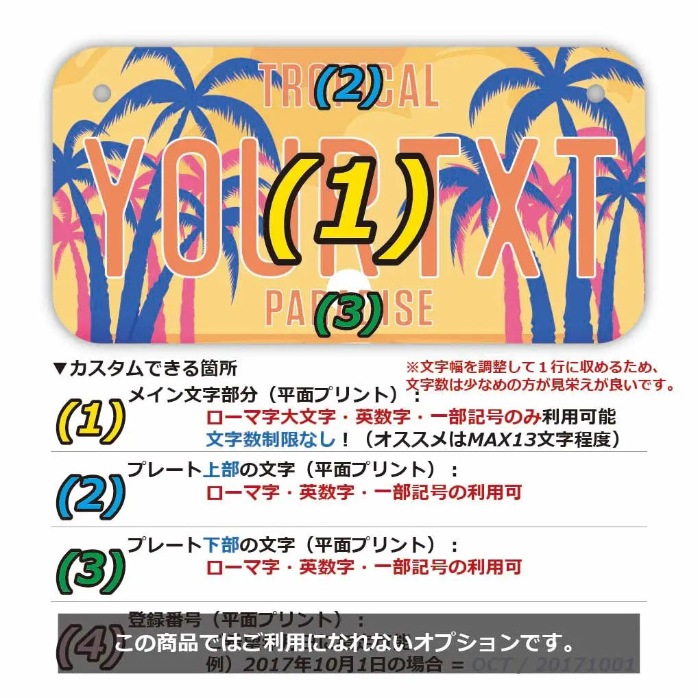 (1)メイン文字にご利用できるフォントは、アメリカナンバープレートに利用されているものと類似のフォントを使っています。