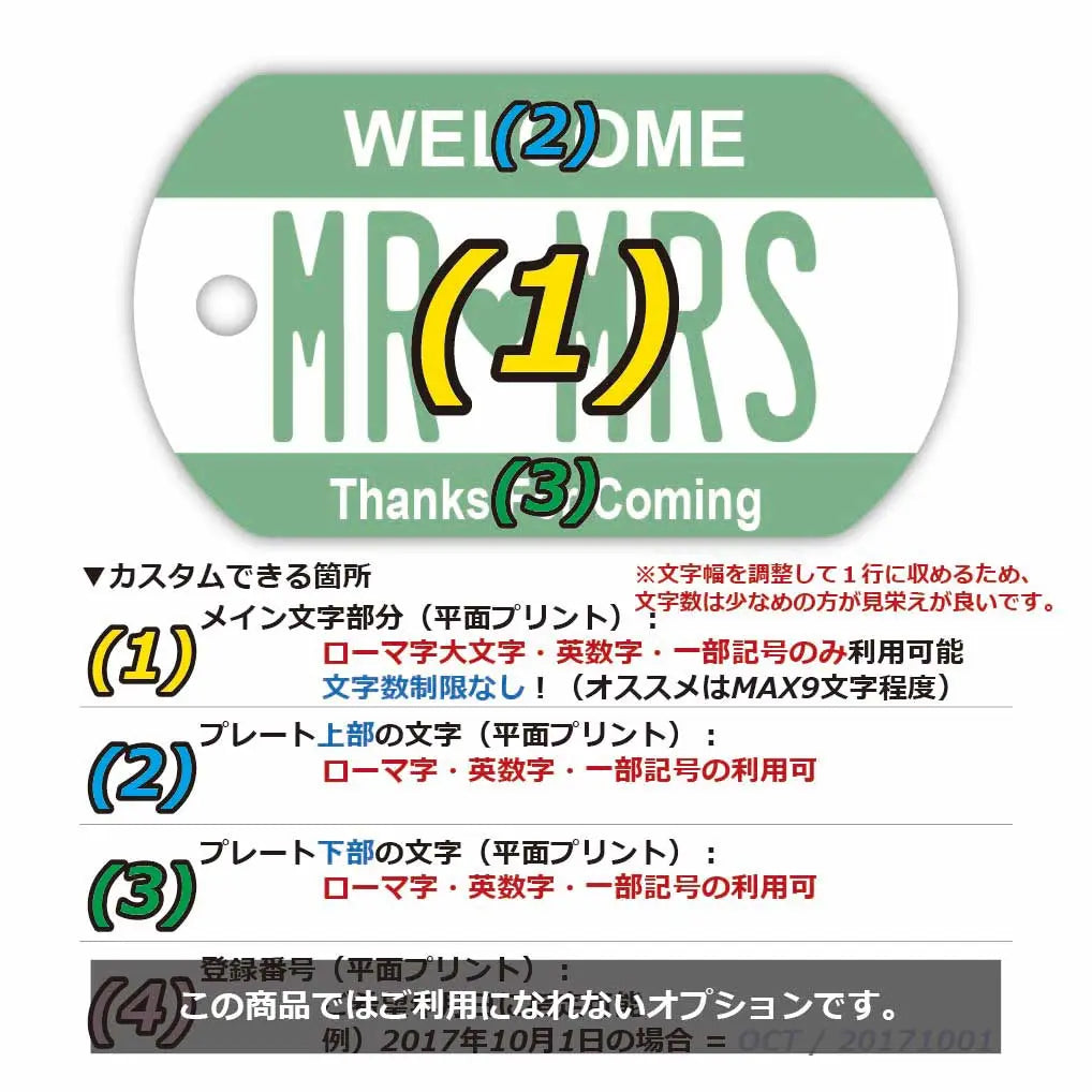 上記のように、【文字部分】は全てカスタマイズ可能です!(1)から(4)の要素をそれぞれご指定が可能。デザインによってはカスタマイズできない場合もあるので、詳しくは各商品の商品画像2枚目に掲載されている説明画像よりご確認ください。