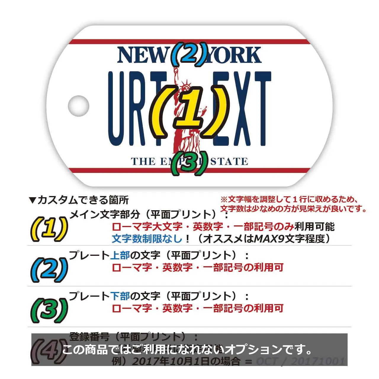 (1)メイン文字にご利用できるフォントは、アメリカナンバープレートに利用されているものと類似のフォントを使っています。