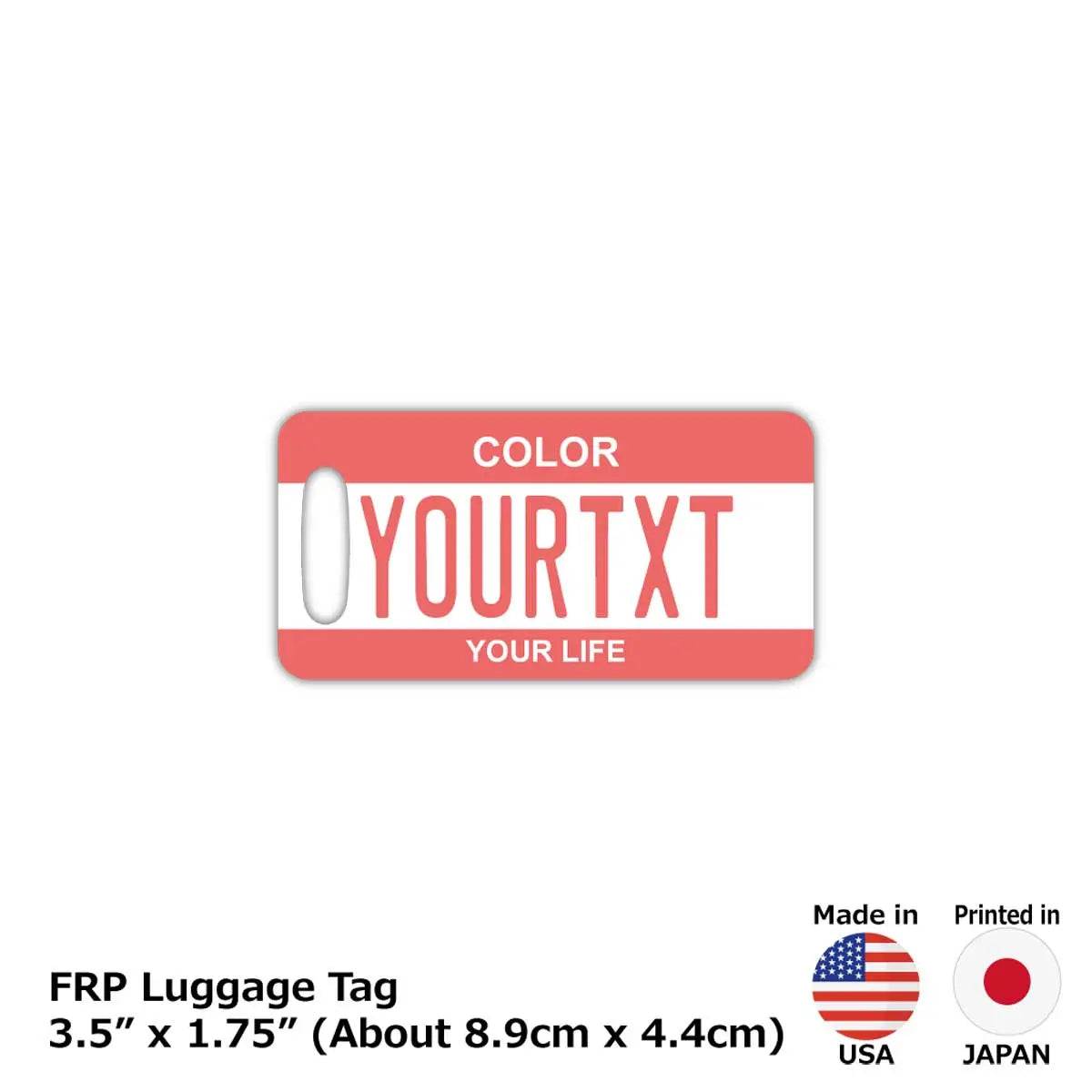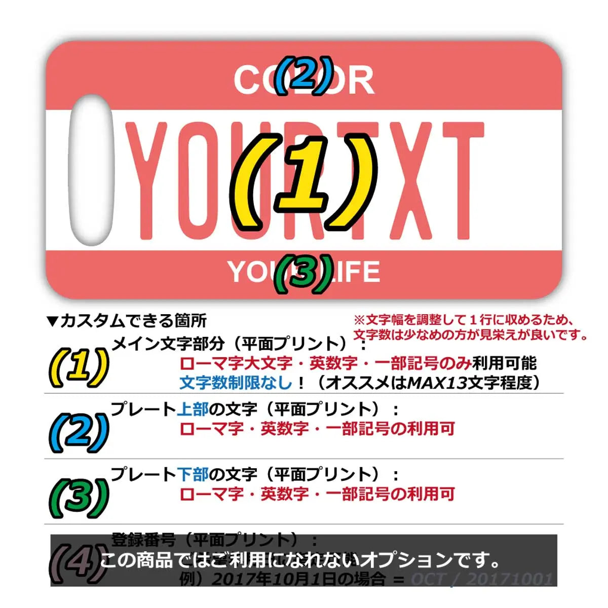 もちろん、オモテとウラ両面のカスタマイズが可能。デザインはアメリカのナンバープレートをモチーフとし、所有者の名前、住所、国名、電話番号、メールアドレス等を表記でき、紛失防止タグとしてしっかりお役に立てます!
