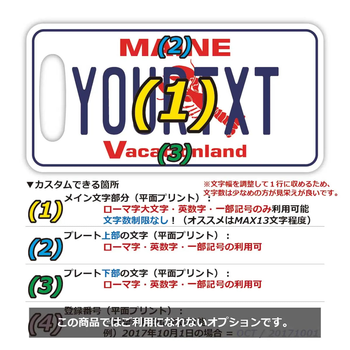 もちろん、オモテとウラ両面のカスタマイズが可能。デザインはアメリカのナンバープレートをモチーフとし、所有者の名前、住所、国名、電話番号、メールアドレス等を表記でき、紛失防止タグとしてしっかりお役に立てます!