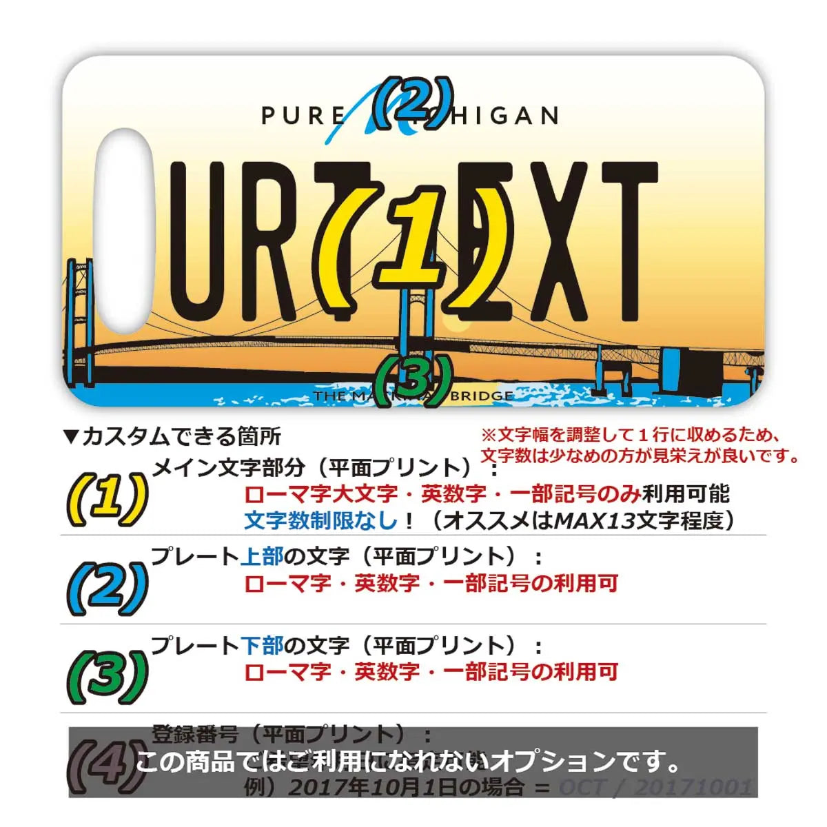 (1)メイン文字にご利用できるフォントは、アメリカナンバープレートに利用されているものと類似のフォントを使っています。