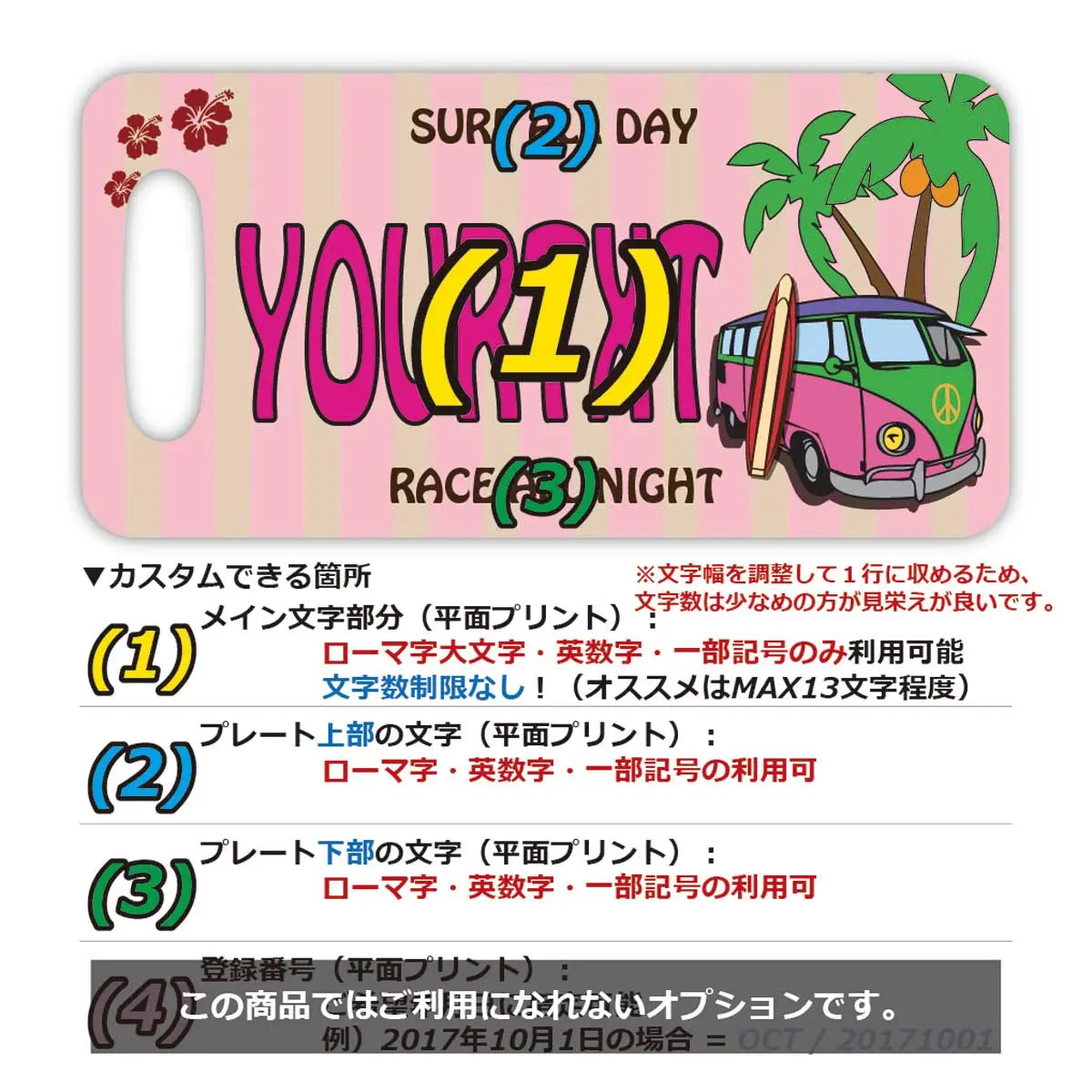 上記のように、【文字部分】は全てカスタマイズ可能です!(1)から(4)の要素をそれぞれご指定が可能。デザインによってはカスタマイズできない場合もあるので、詳しくは各商品の商品画像2枚目に掲載されている説明画像よりご確認ください。