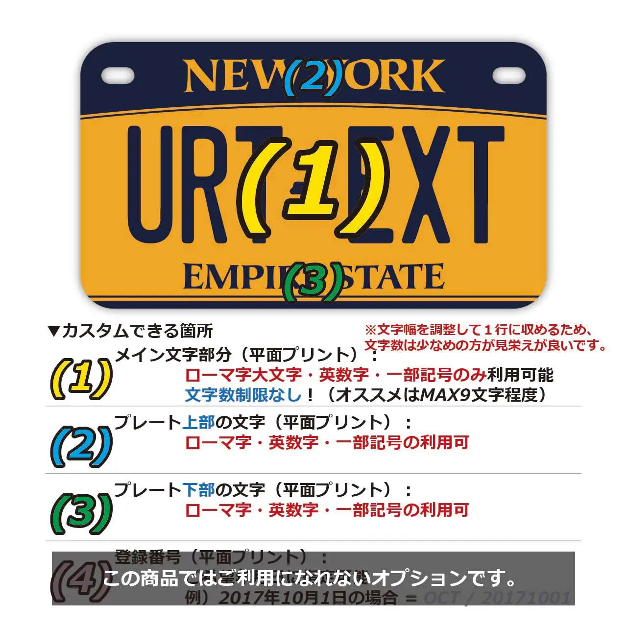 (1)メイン文字にご利用できるフォントは、アメリカナンバープレートに利用されているものと類似のフォントを使っています。