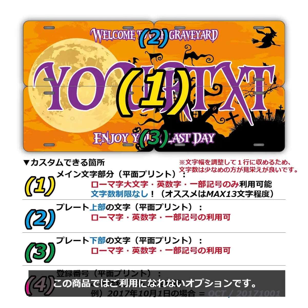 (1)メイン文字にご利用できるフォントは、アメリカナンバープレートに利用されているものと類似のフォントを使っています。