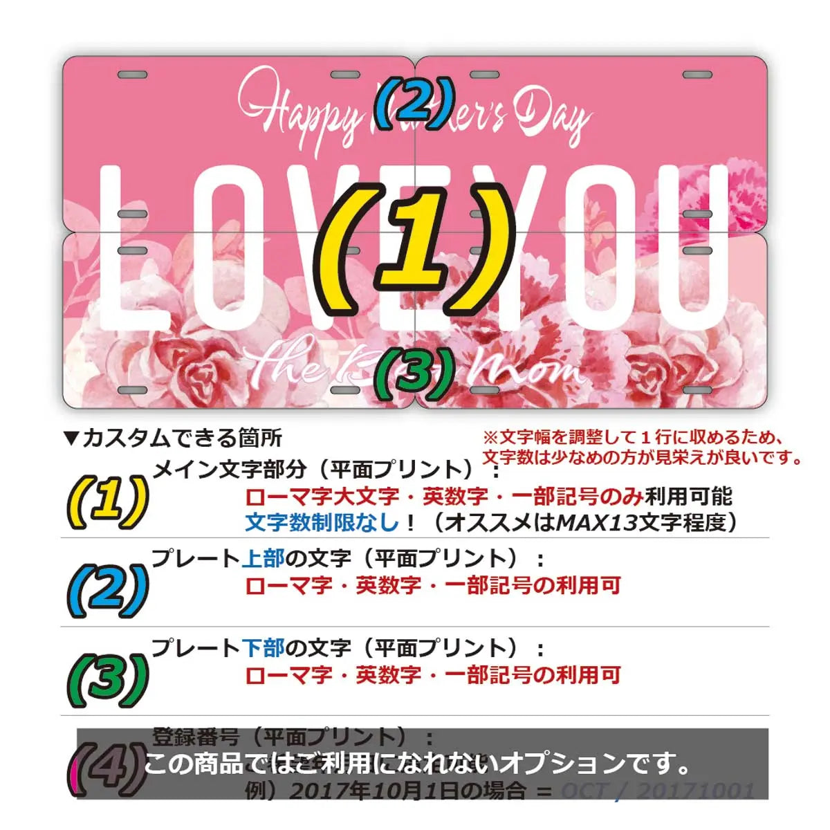 上記のように、【文字部分】は全てカスタマイズ可能です!(1)から(4)の要素をそれぞれご指定が可能。デザインによってはカスタマイズできない場合もあるので、詳しくは各商品の商品画像2枚目に掲載されている説明画像よりご確認ください。