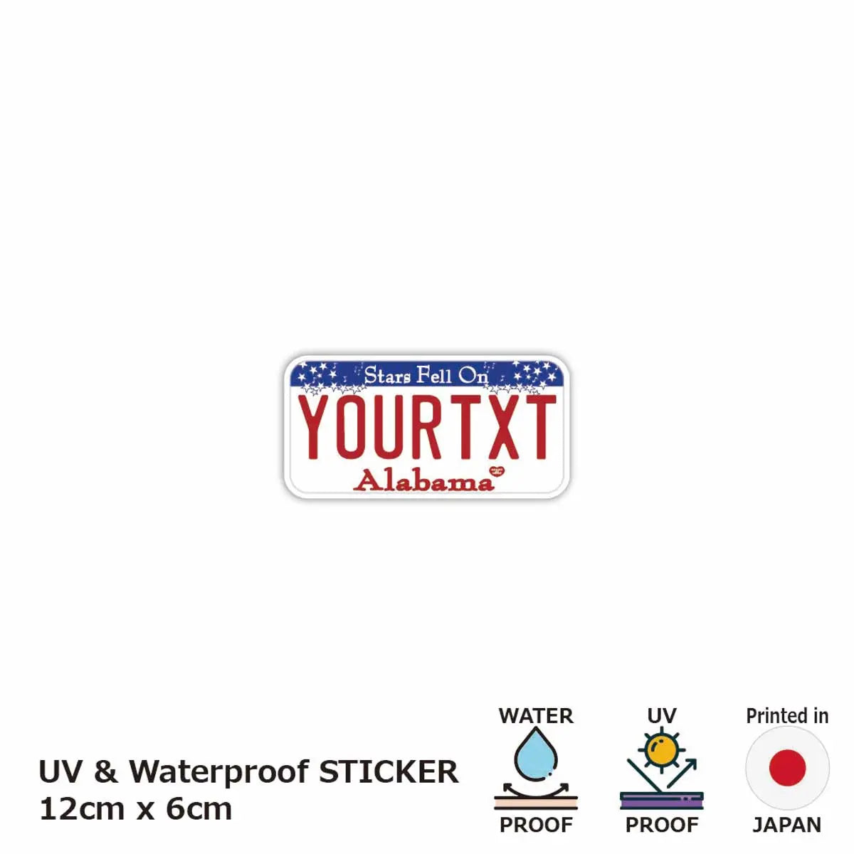 ご希望文字で1枚から生産できる、オリジナル・アメリカライセンスプレート型ステッカー!日本国内でプリントした強粘着タイプ。PVCコーティングを施し、耐水・耐候で光沢のある仕上がり。屋外使用はもちろん、お車の車体に貼り付けてもOKなタフさ!