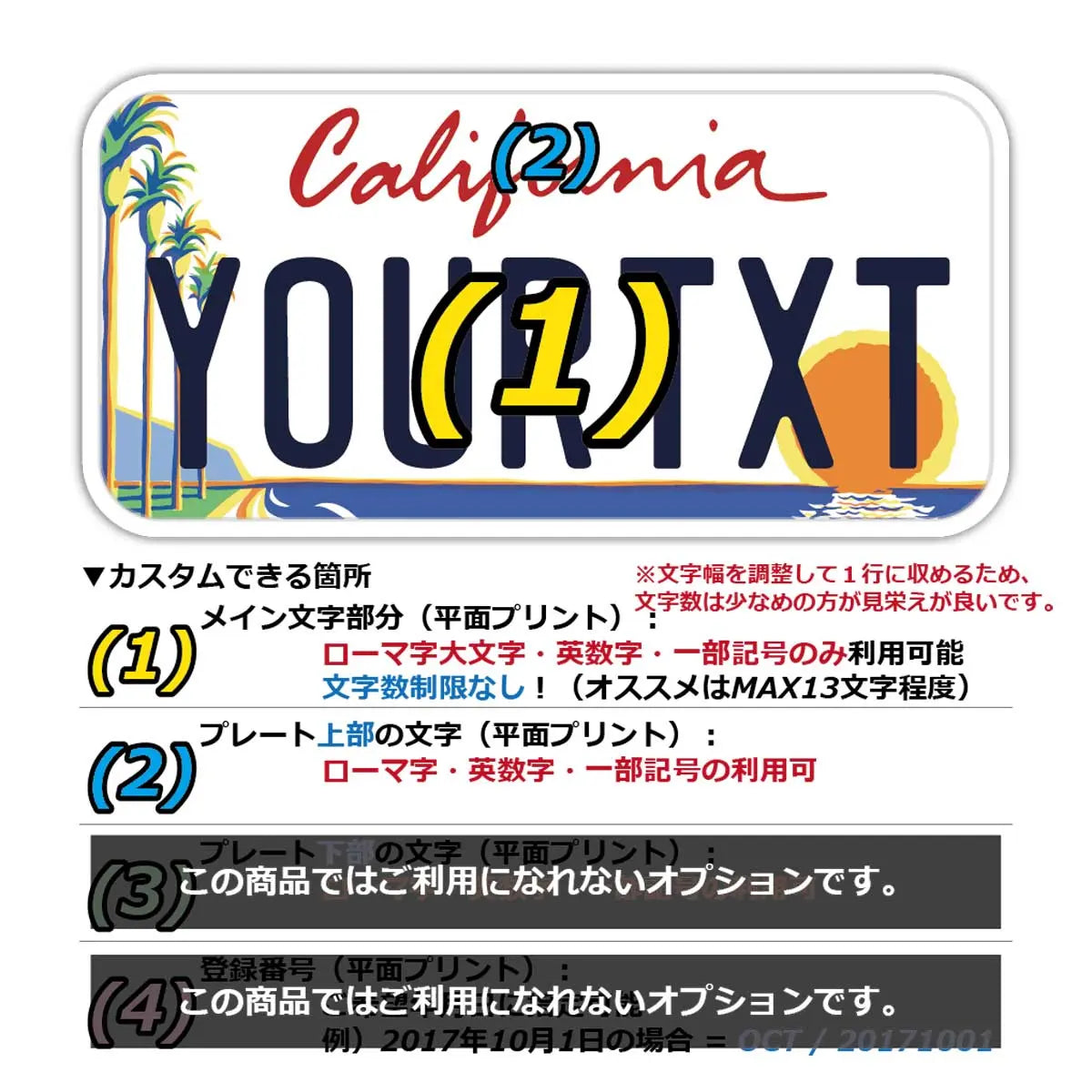 (1)メイン文字にご利用できるフォントは、アメリカナンバープレートに利用されているものと類似のフォントを使っています。