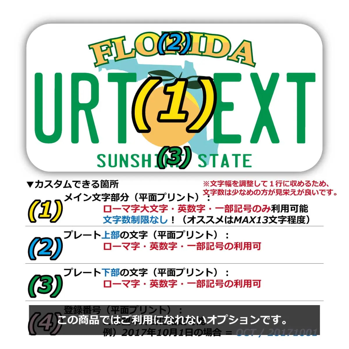(1)メイン文字にご利用できるフォントは、アメリカナンバープレートに利用されているものと類似のフォントを使っています。